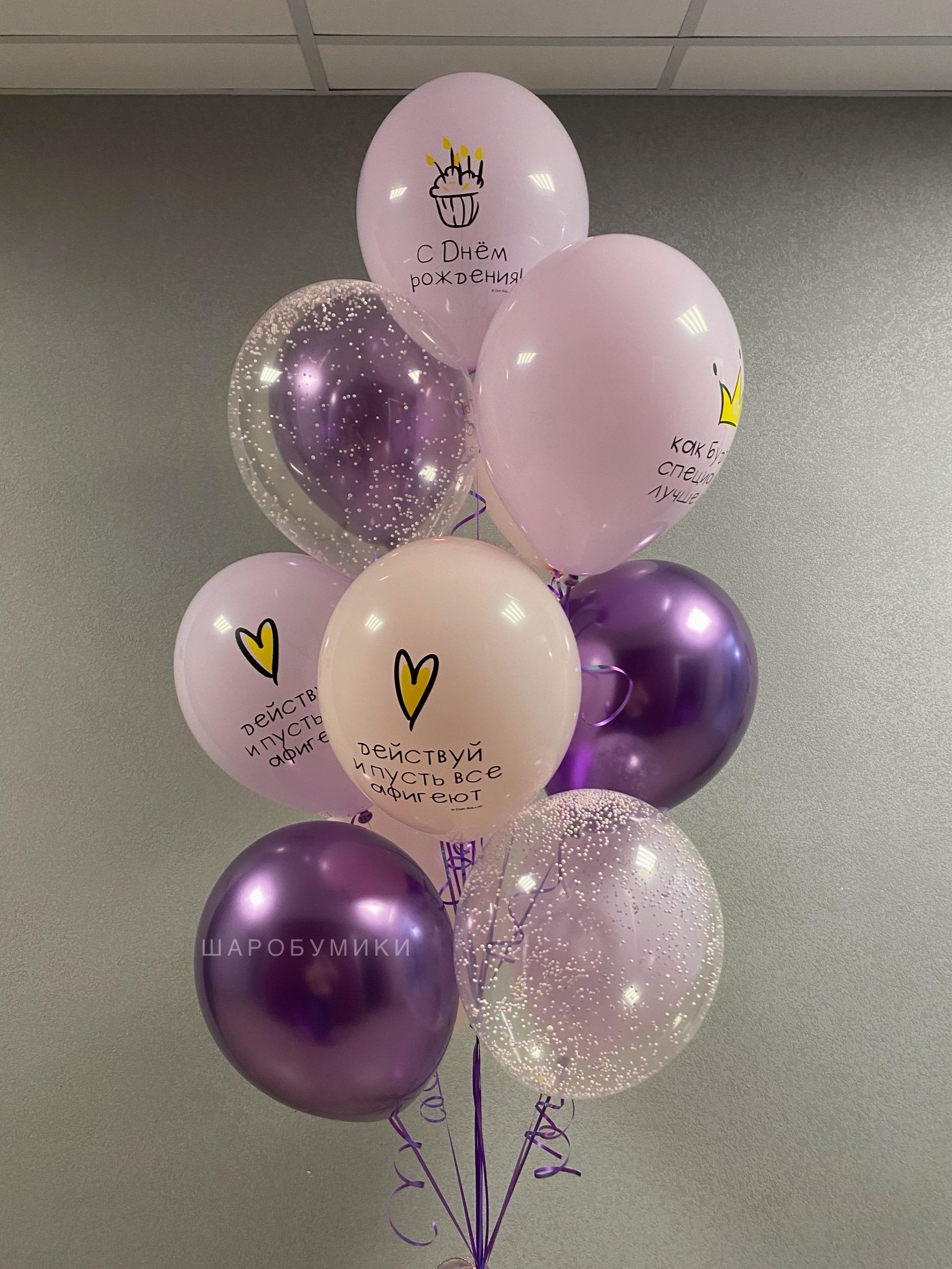 Композиция из 13 шаров: 4 шара с рисунком 3 шара хром 3 шара с конфетти 3 шара пастель Цвет и Оформление подбирается индивидуально