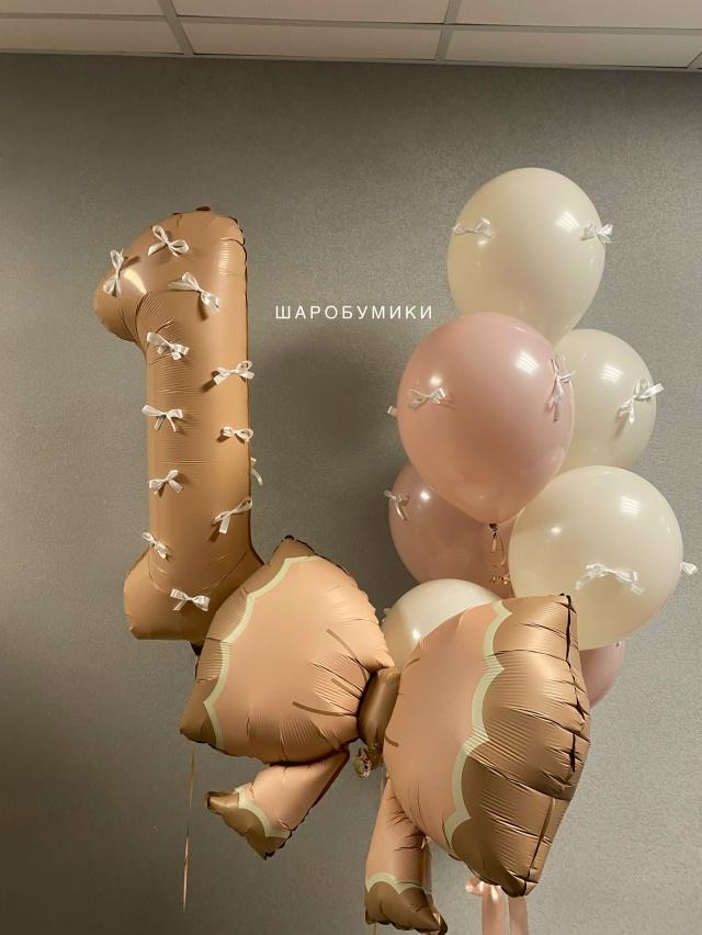 Композиция из одной фольгированной цифры в бантиках, фольгированного бантика и 10 шаров в оттенке пастель с бантиками. Цвет и оформление выбирается индивидуально.