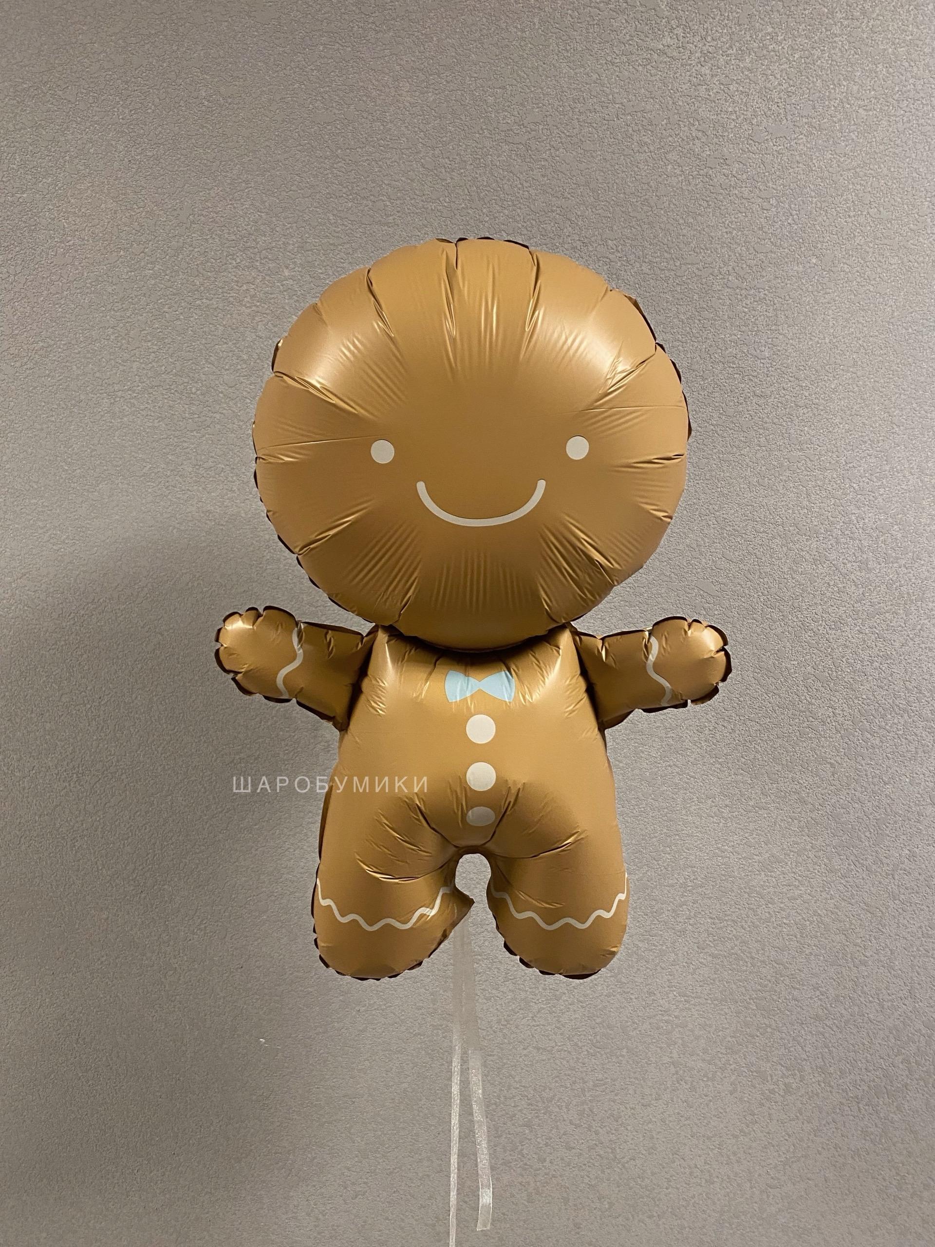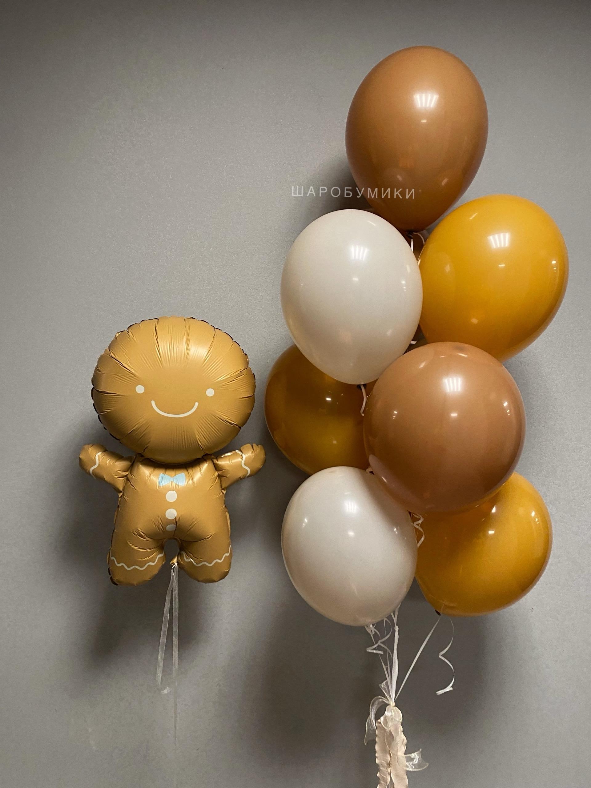 Композиция из фольгированной фигуры Пряничный человечек и 10 шаров в оттенке пастель. Цвет и оформление выбирается индивидуально.