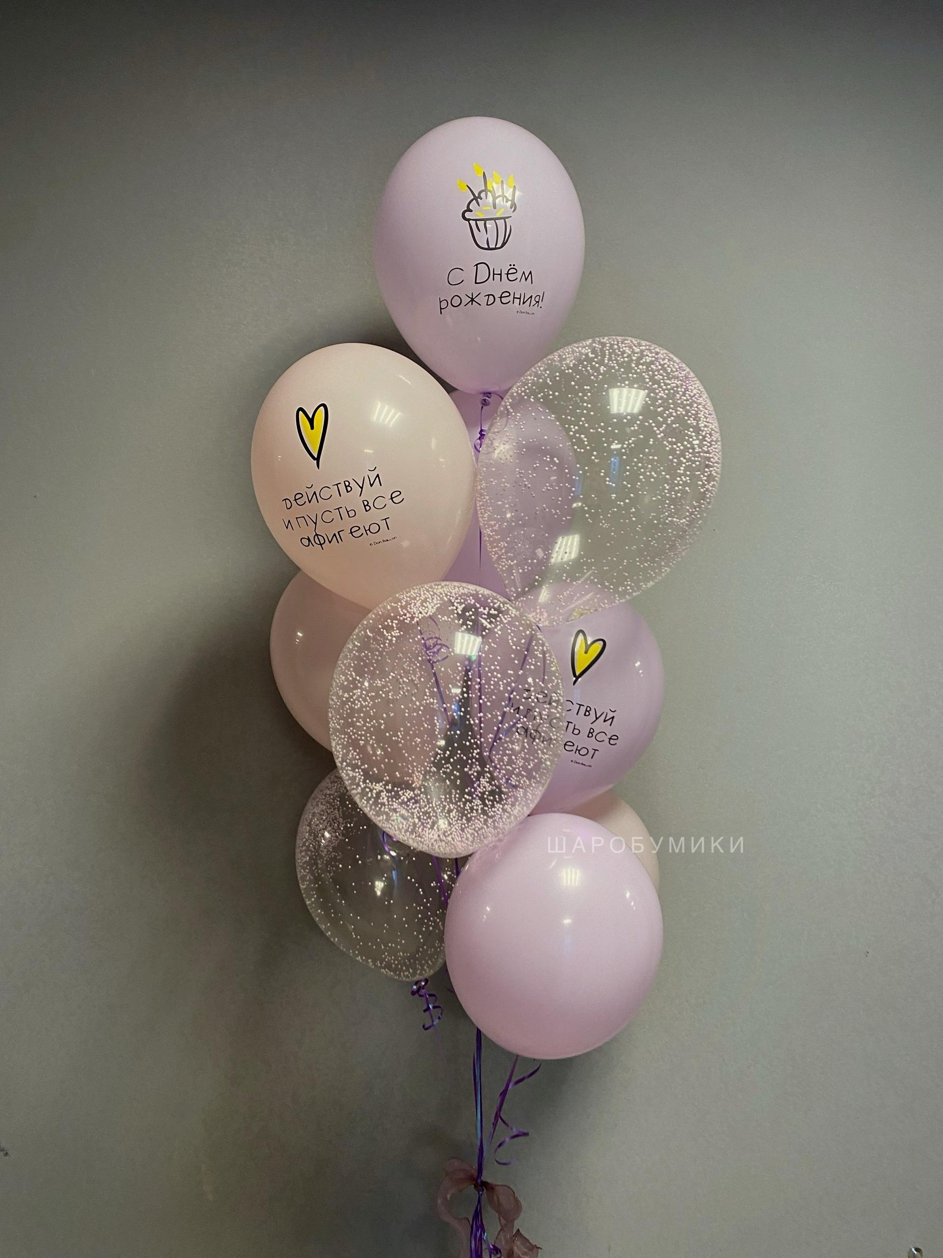 Композиция из 3 шаров в оттенке пастель, 3 шаров с конфетти и 4 шара с надписями Шар- Гигант с конфетти и перьями. Цвет и оформление выбирается индивидуально. Индивидуальная надпись на шар.