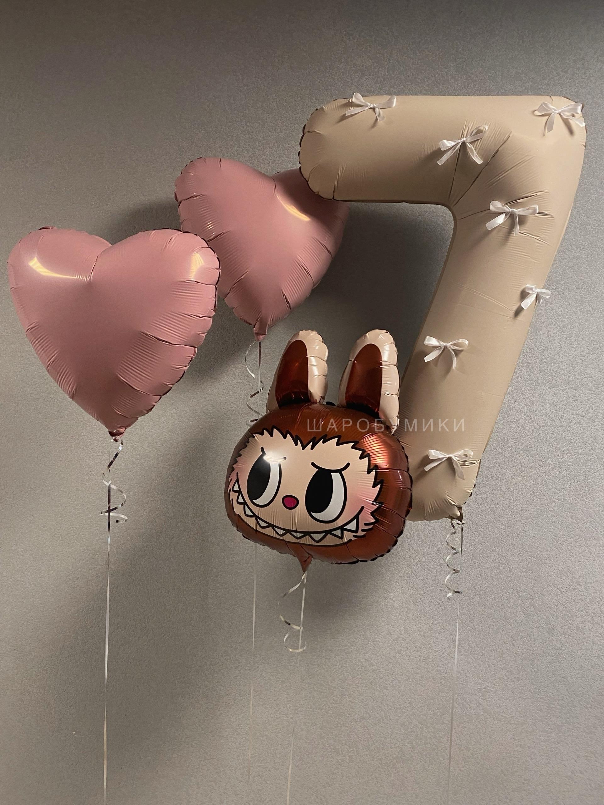 В композицию входит 2 сердца (40-45 см) в ассортименте, цифра в ассортименте с бантиками, и фигурка Лабубу. Цвет и оформление выбирается индивидуально.