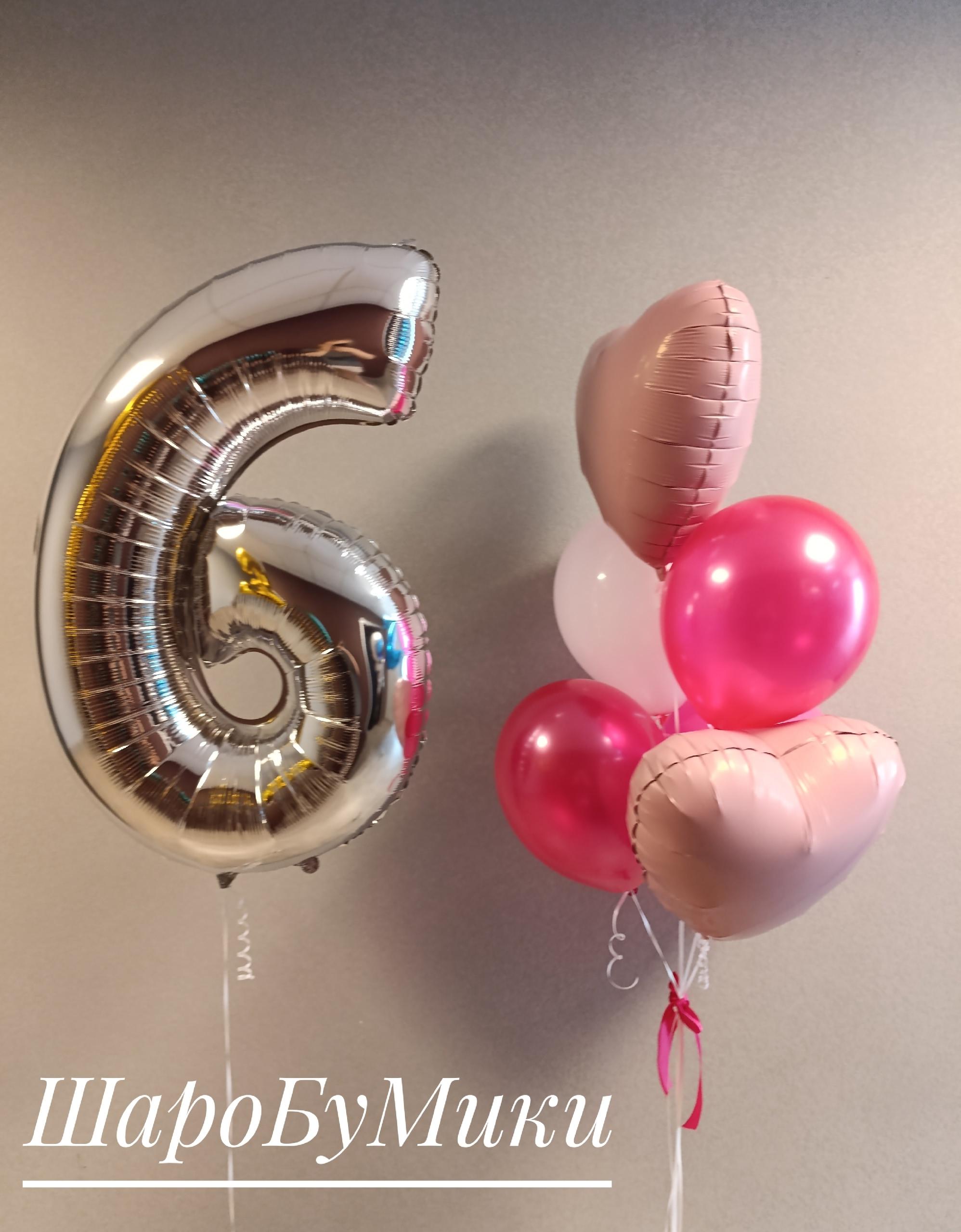 Композиция из фольгированных фигур сердца 2 штуки, и 4 шаров в оттенке пастель/металлик и фольгированная цифра в ассортименте. Цвет и оформление выбирается индивидуально.