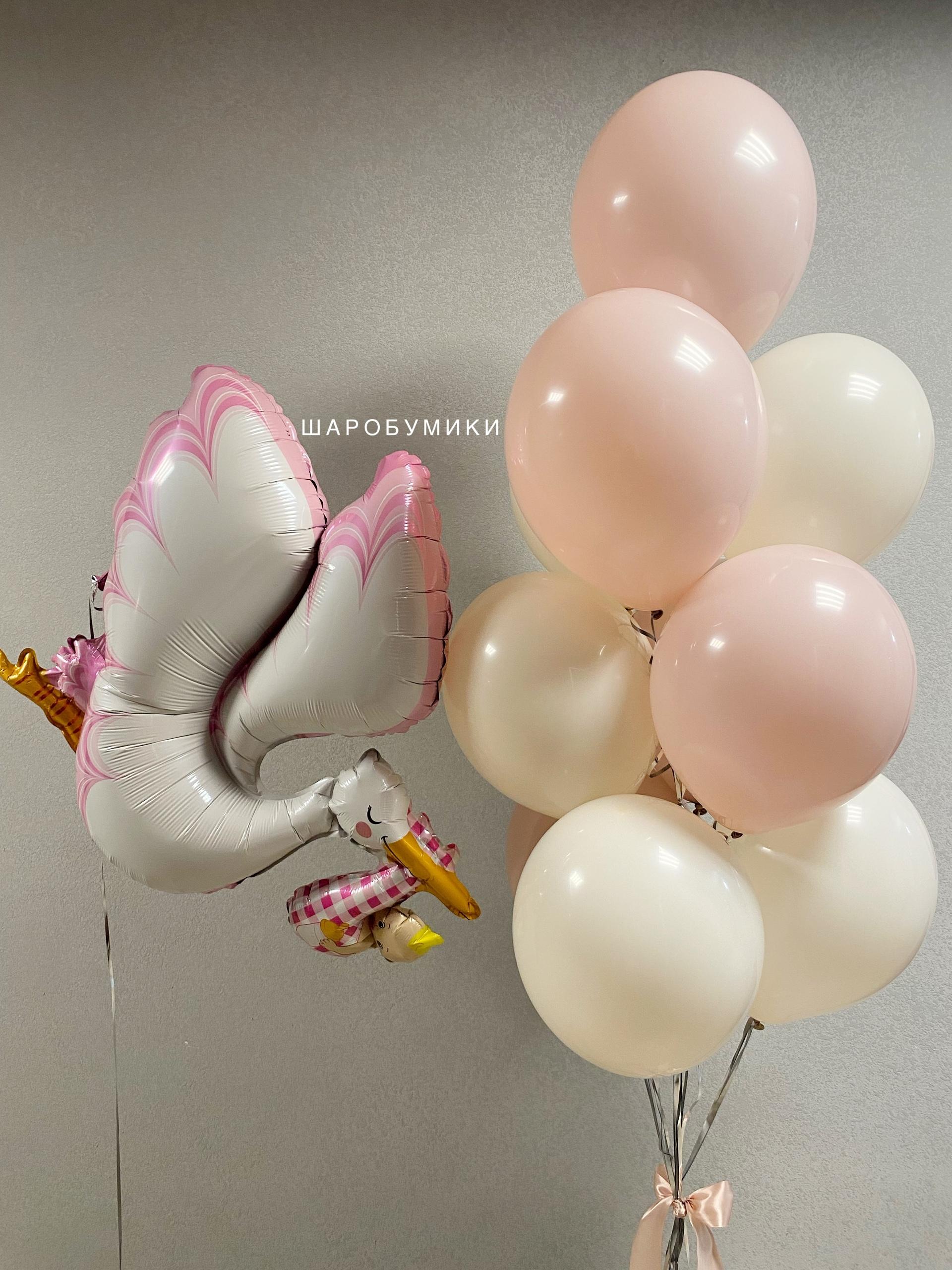 Композиция из фольгированной фигуры аист и 10 шаров в оттенке пастель. Цвет и оформление выбирается индивидуально.