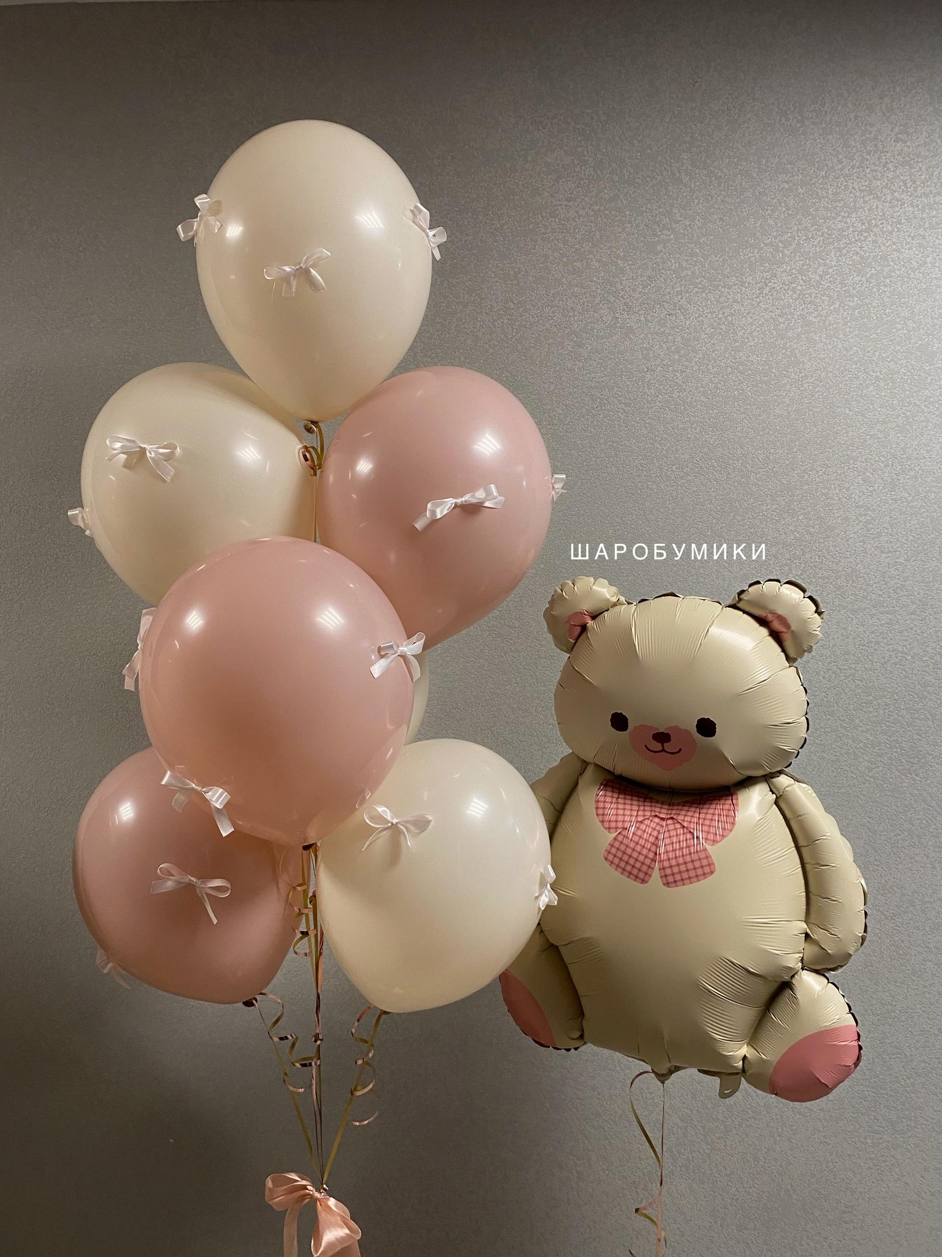 Композиция из фольгированной фигуры мишка и 10 шаров в оттенке пастель с бантиками. Цвет и оформление выбирается индивидуально.