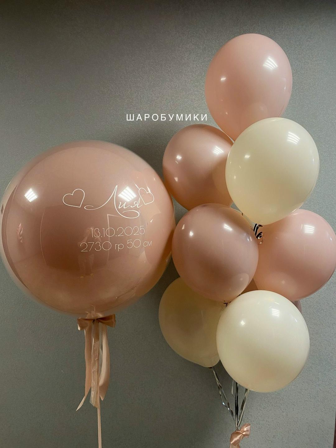 Композиция из 10 шаров в оттенке пастель и двойной Шар-Гигант. Цвет и оформление выбирается индивидуально. Индивидуальная надпись на шар.