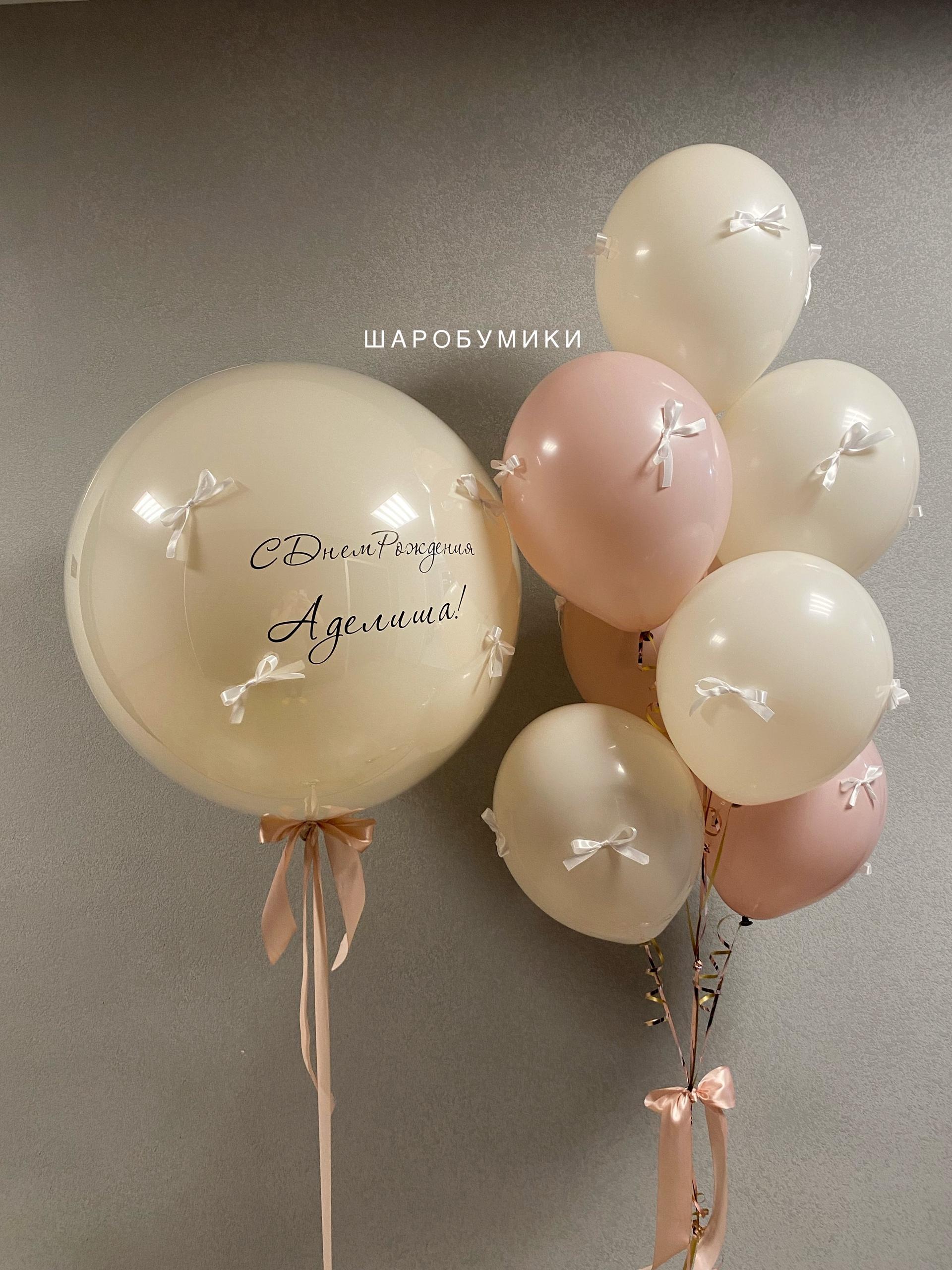 Композиция из 10 шаров в оттенке пастель с бантиками и двойной Шар-Гигант с бантиками. Цвет и оформление выбирается индивидуально. Индивидуальная надпись на шар.