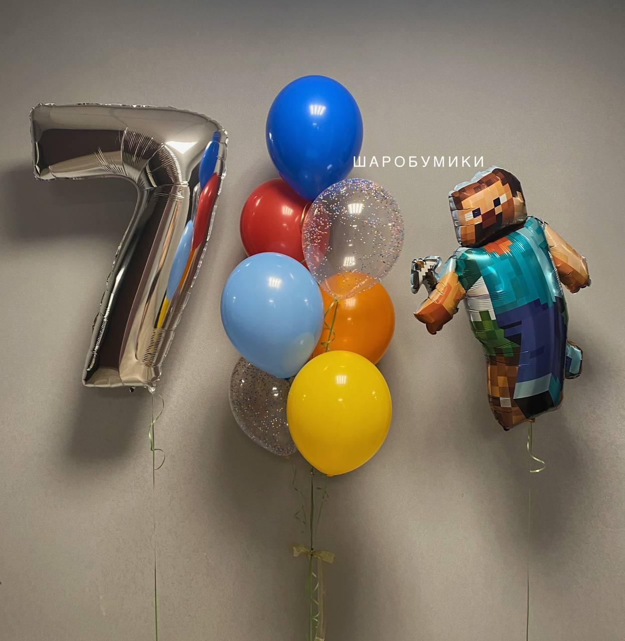 Композиция из фольгированной фигуры Пиксельный Человечек и 7 шаров. Фольгированная цифра в ассортименте. Цвет и оформление выбирается индивидуально.