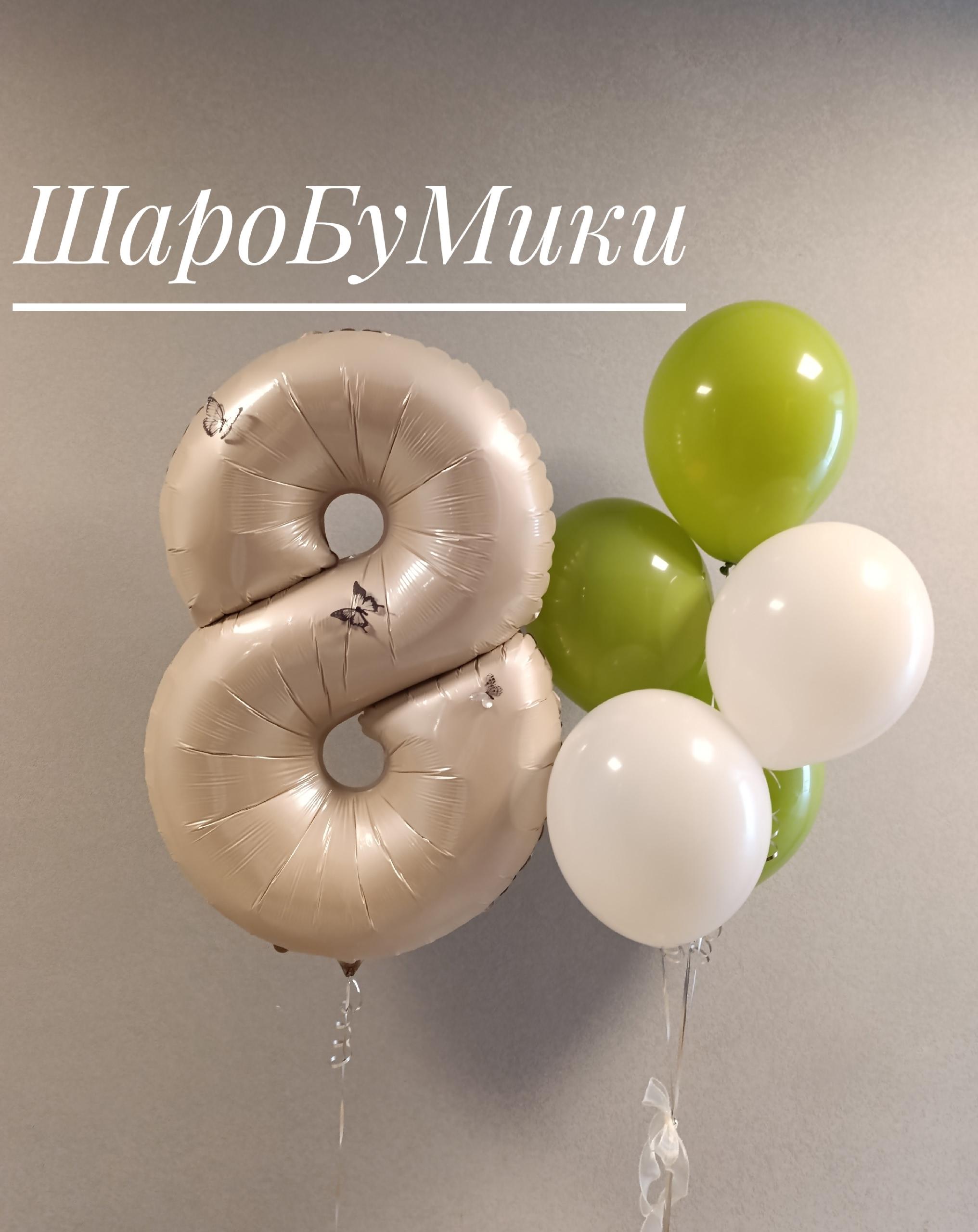 Композиция из 5 шаров в оттенке пастель и фольгированная цифра с бабочками. Цвет и оформление выбирается индивидуально.