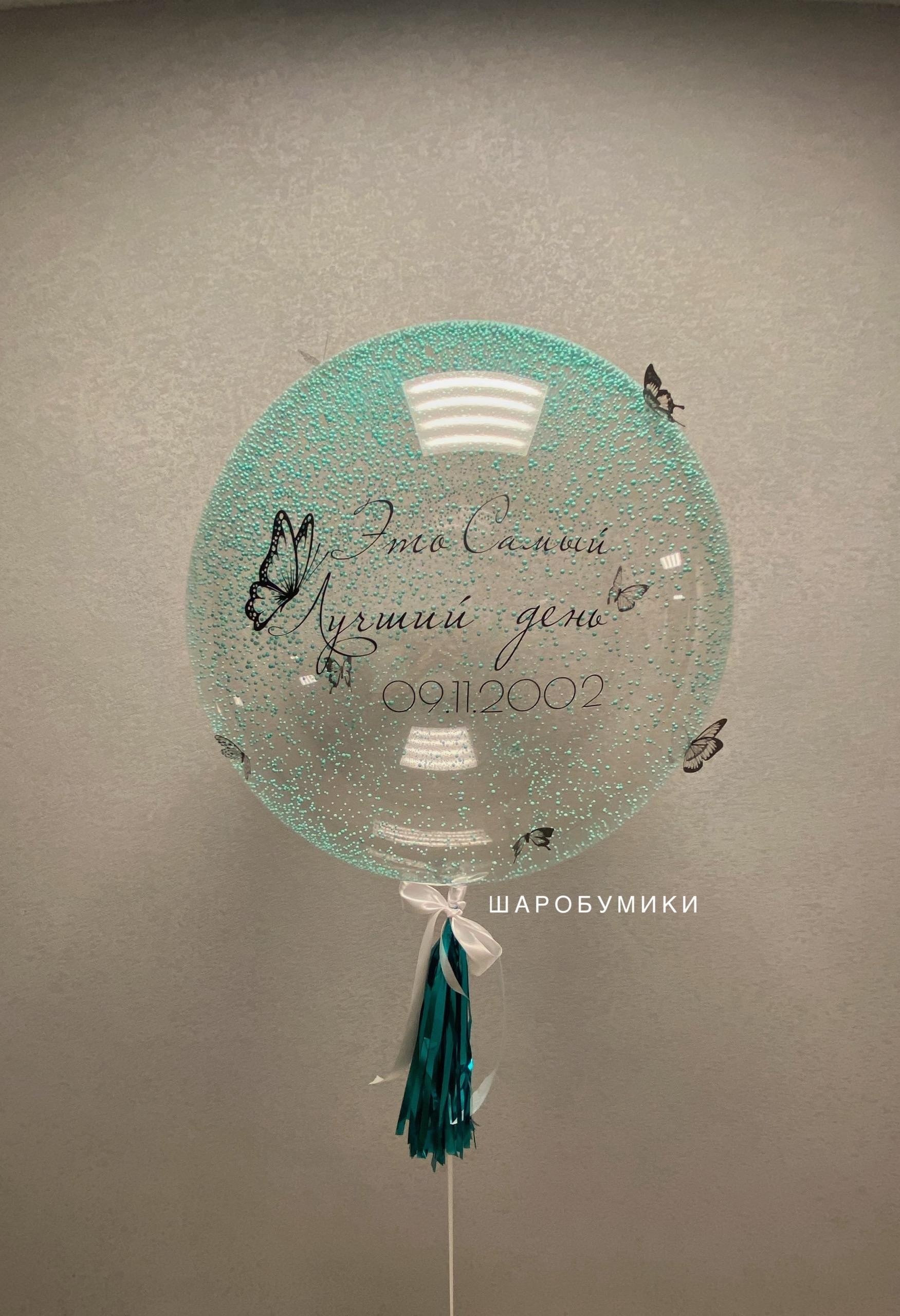 Шар-Гигант 55-60-сантиметров с пенопластом, украшенный бабочками. Индивидуальная надпись на шар.