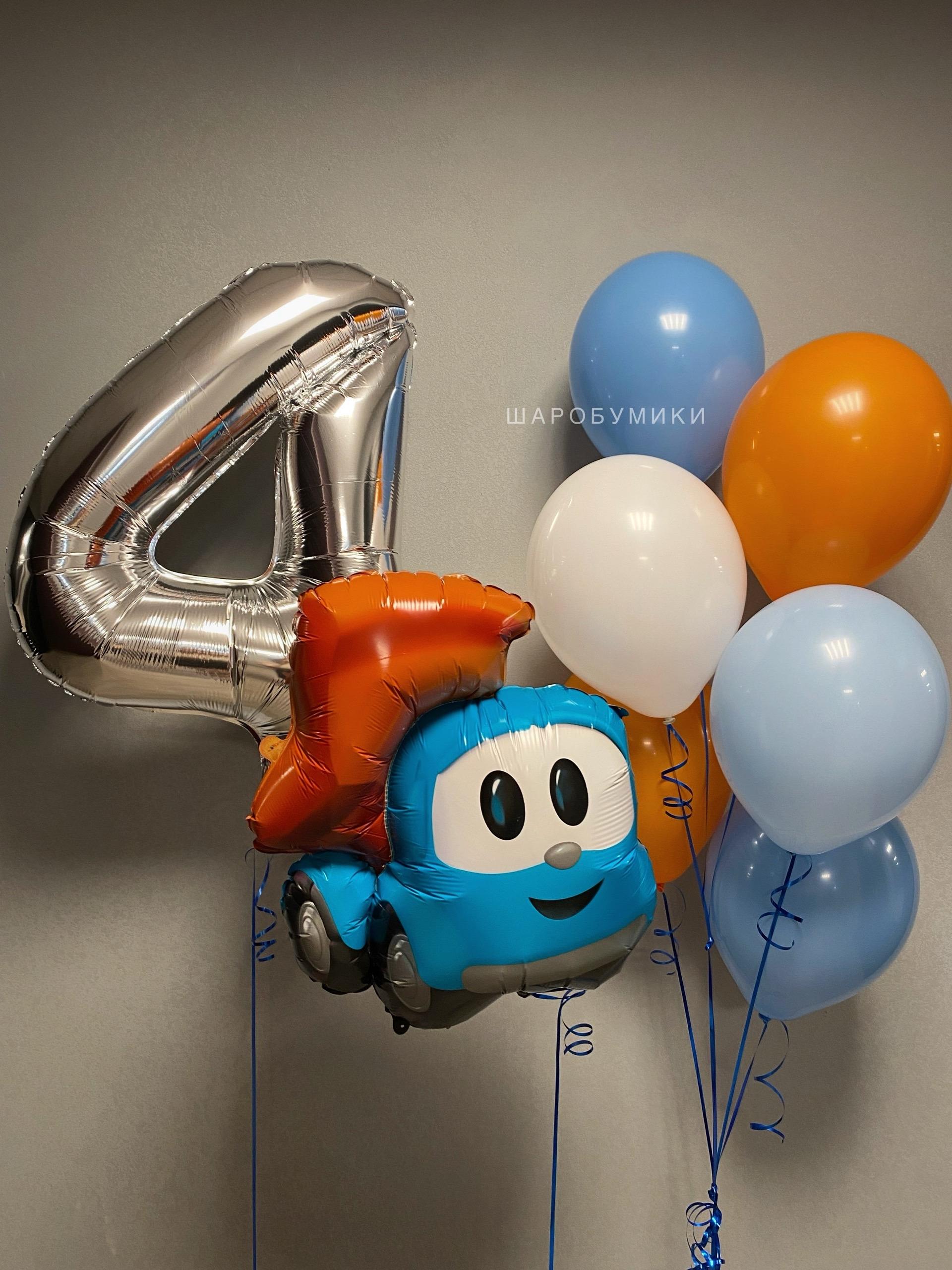 Композиция из фольгированной фигуры Грузовичок Лева и 7 шаров пастель . Фольгированная цифра в ассортименте. Цвет и оформление выбирается индивидуально.