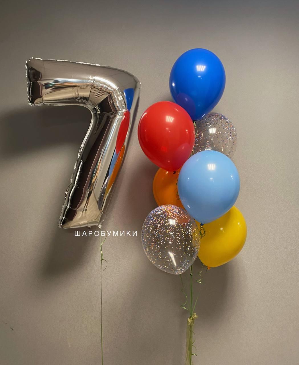 Композиция из фольгированной цифры и 7 шаров. Фольгированная цифра в ассортименте. Цвет и оформление выбирается индивидуально.