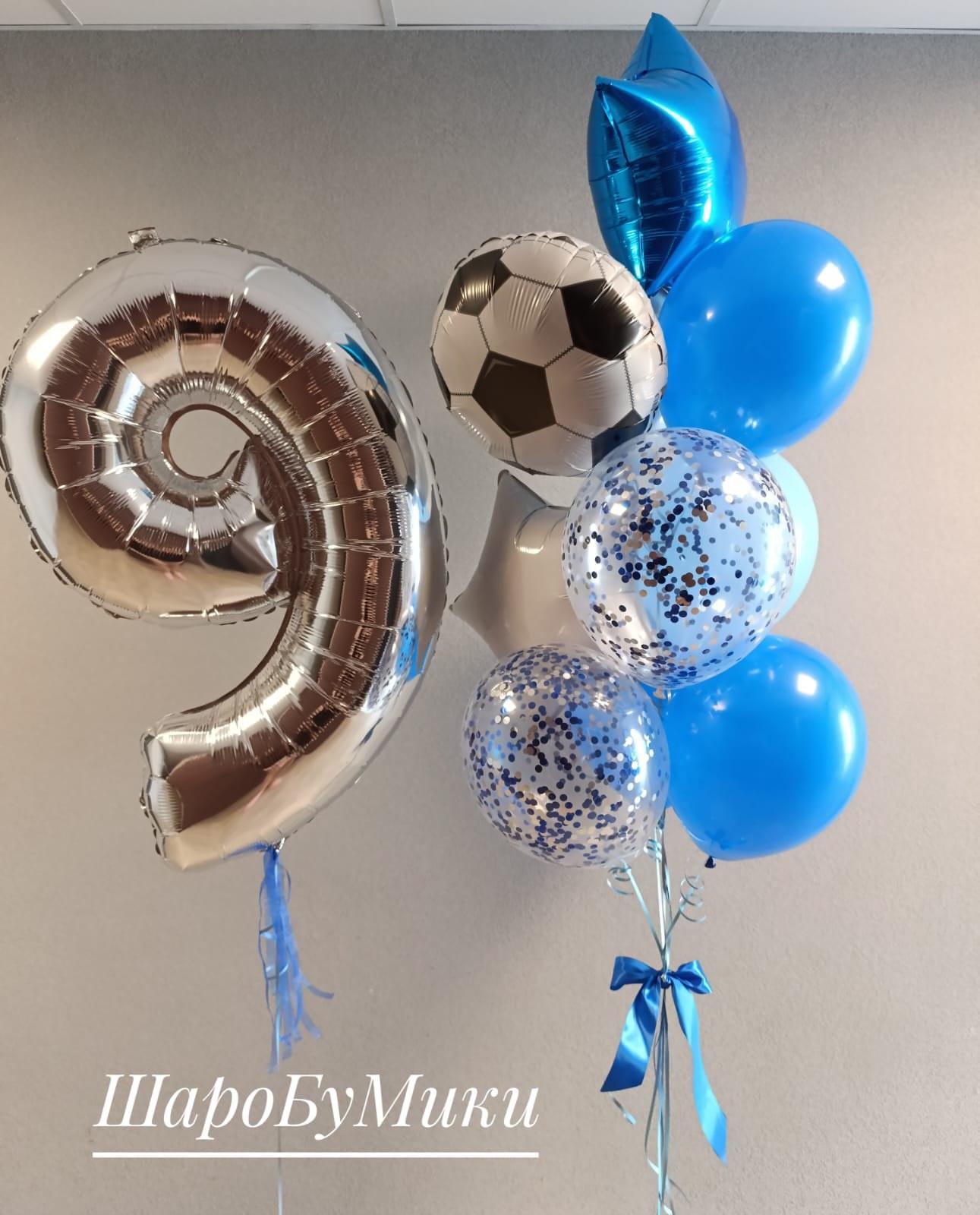 Композиция из фольгированной фигуры мяч и 4 шара в оттенке пастель, 2 шара с конфетти, 2 звезды в ассортименте и фольгированная цифра в ассортименте. Цвет и оформление выбирается индивидуально.