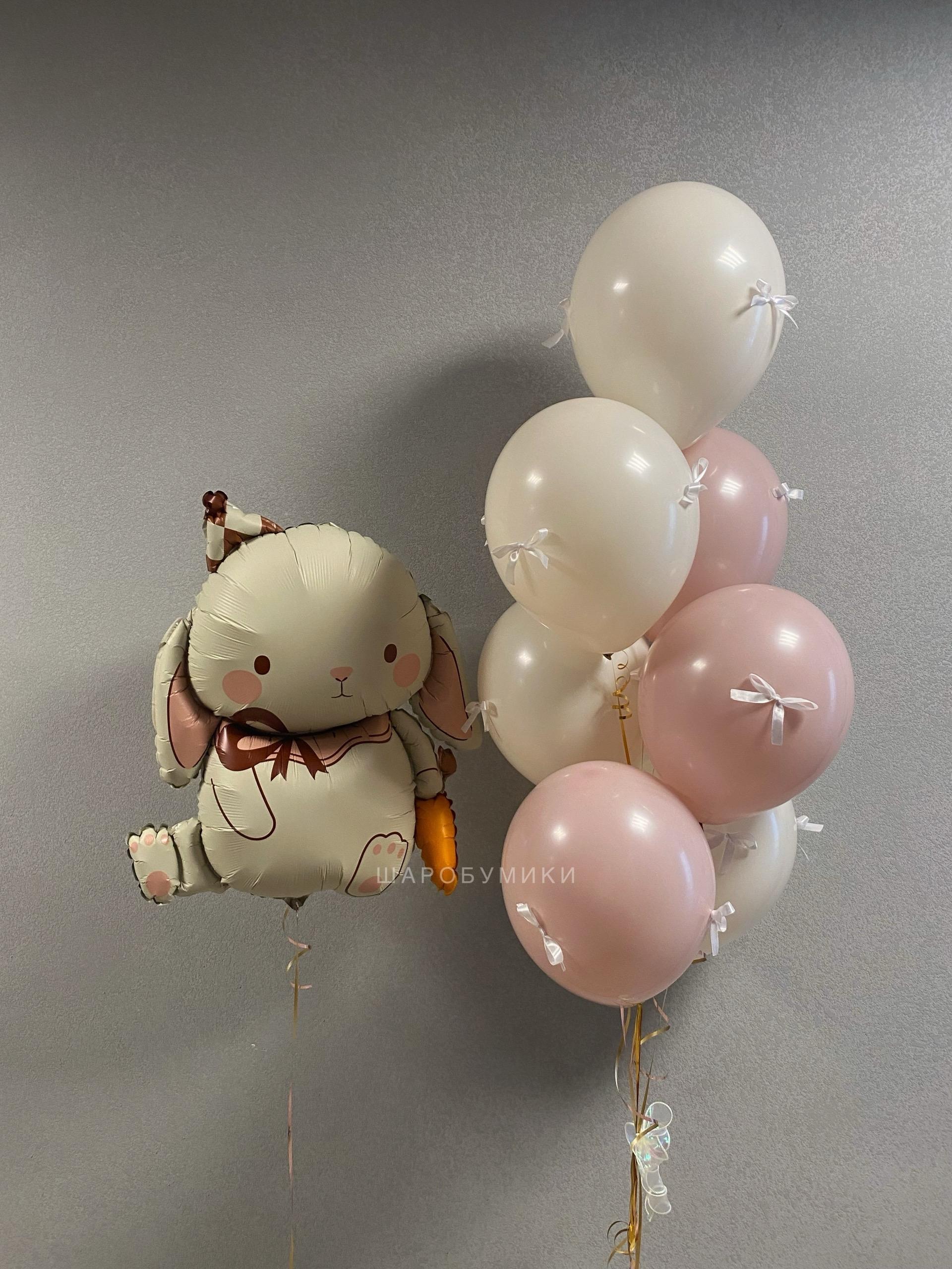 Композиция из фольгированной фигуры зайка и 7 шаров в оттенке пастель с бантиками. Цвет и оформление выбирается индивидуально.